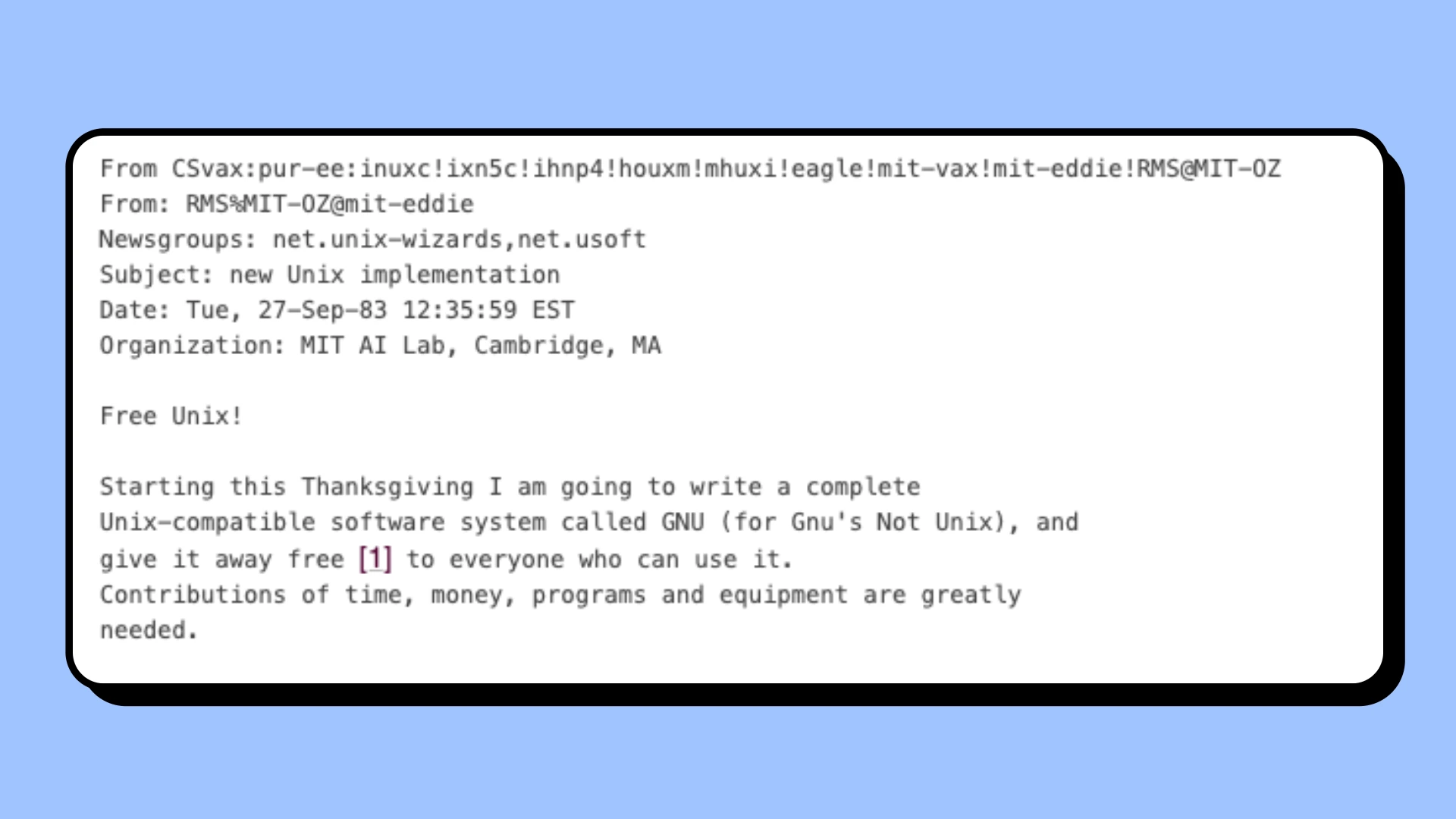 On September 27, 1983, Richard Stallman announced the GNU Project – his plan to create a complete, free Unix-compatible operating system.