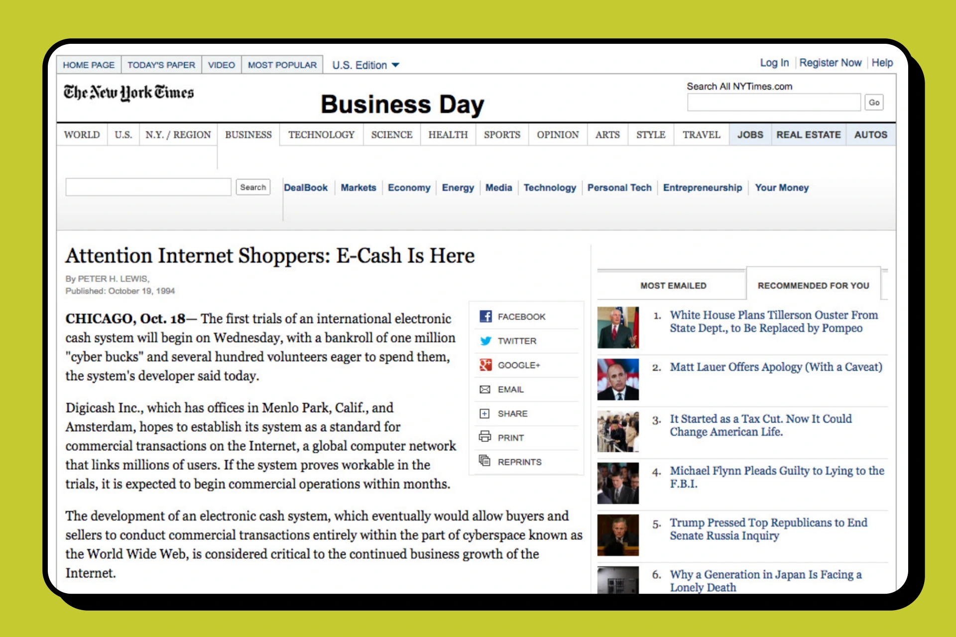On October 19, 1994, the New York Times published an article dedicated to David Chaum's E-Cash.