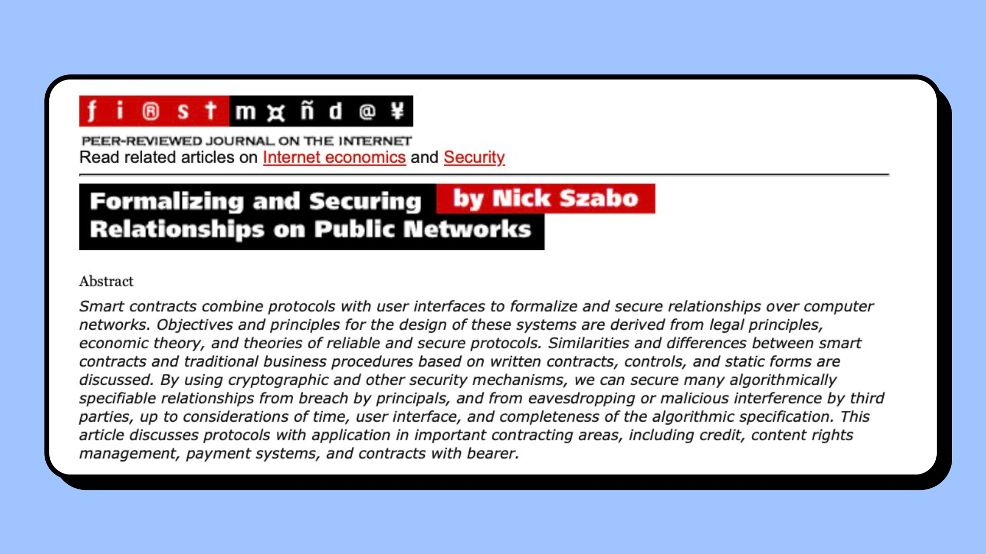On September 1, 1997, Nick Szabo publishes the paper 'Formalizing and Securing Relationships on Public Networks', where he discusses protocols with applications in important contractual areas, including credit, content rights management, and payment systems.