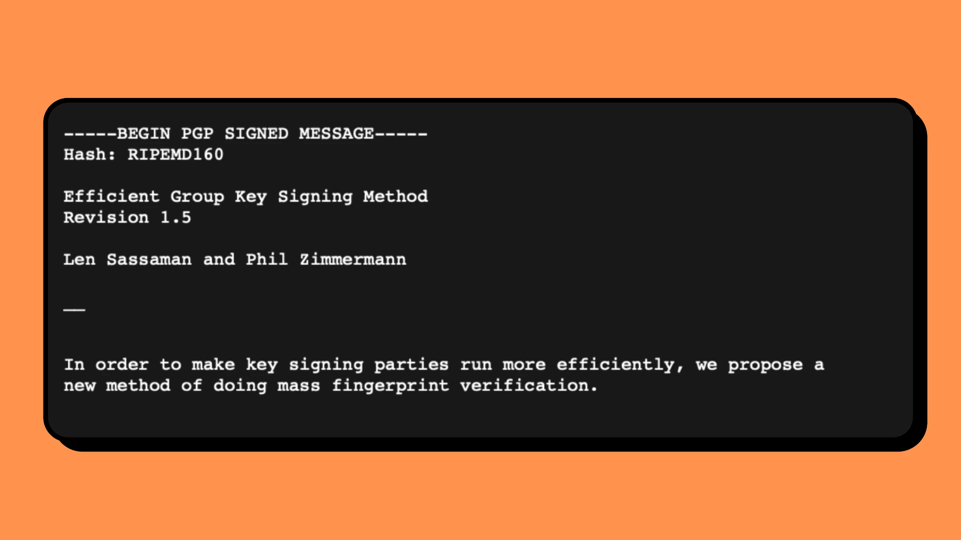 On July 25, 2005, Phil Zimmermann and Len Sassaman published a method for efficient group key signing. Their approach allowed for faster PGP key verification by pre-creating a list of fingerprints and hashing it.