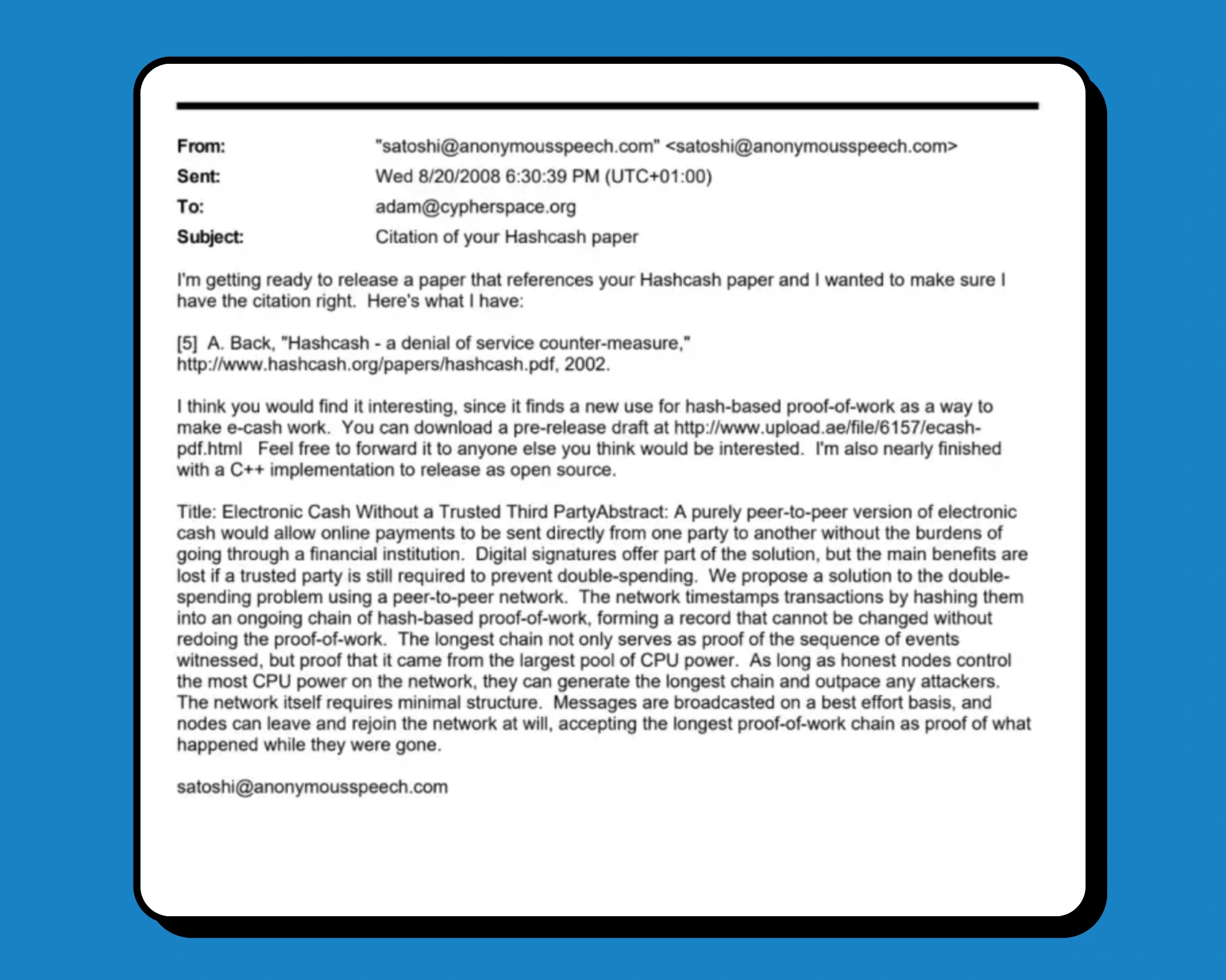 On August 20, 2008, Satoshi sent his first email to Adam Back to inform him of his intention to publish a whitepaper and to confirm the correct reference to Adam's Hashcash.