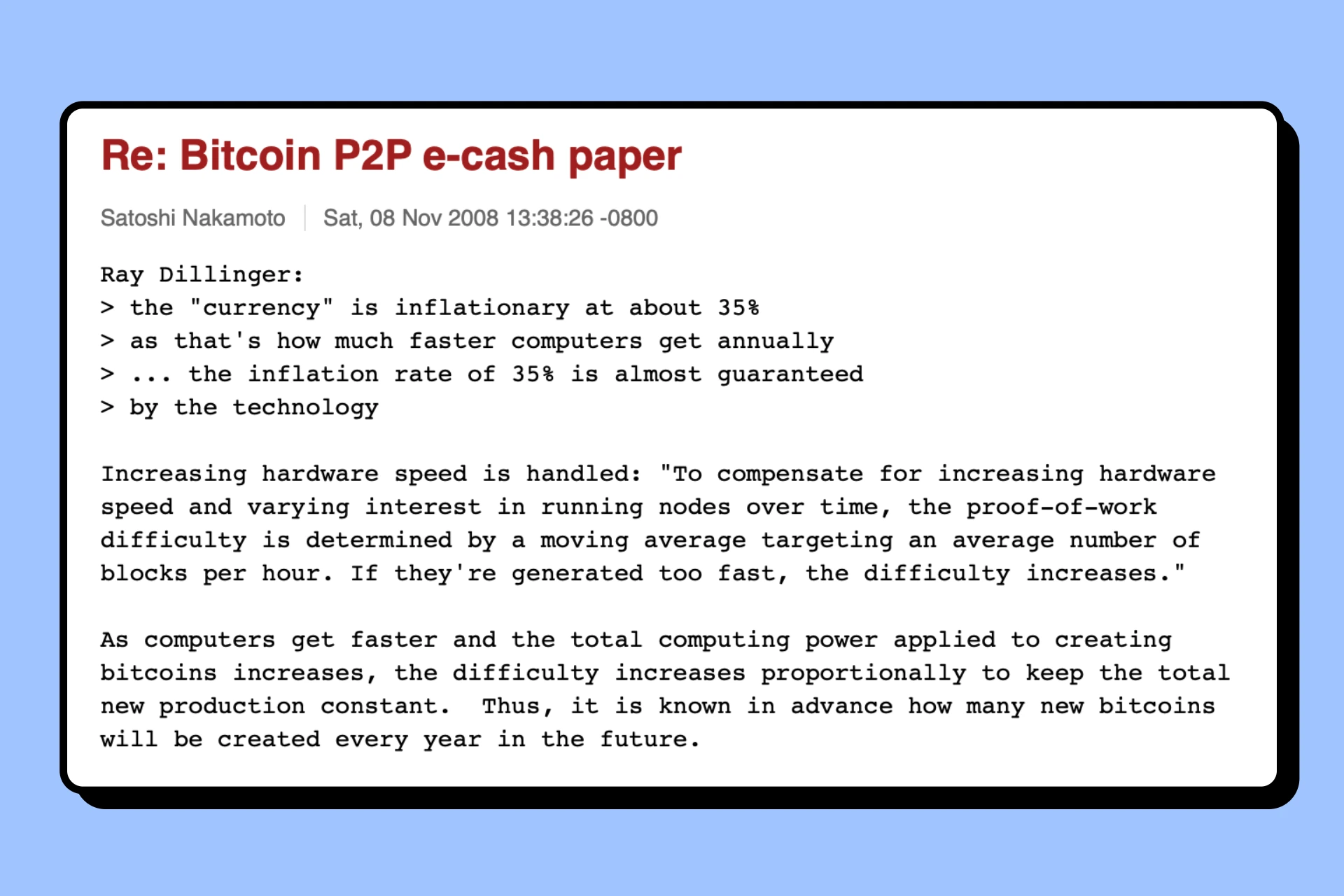 On November 8, 2008, Satoshi explains the significance of Bitcoin's difficulty adjustment mechanism. Find out more about difficulty adjustment by following the link below.