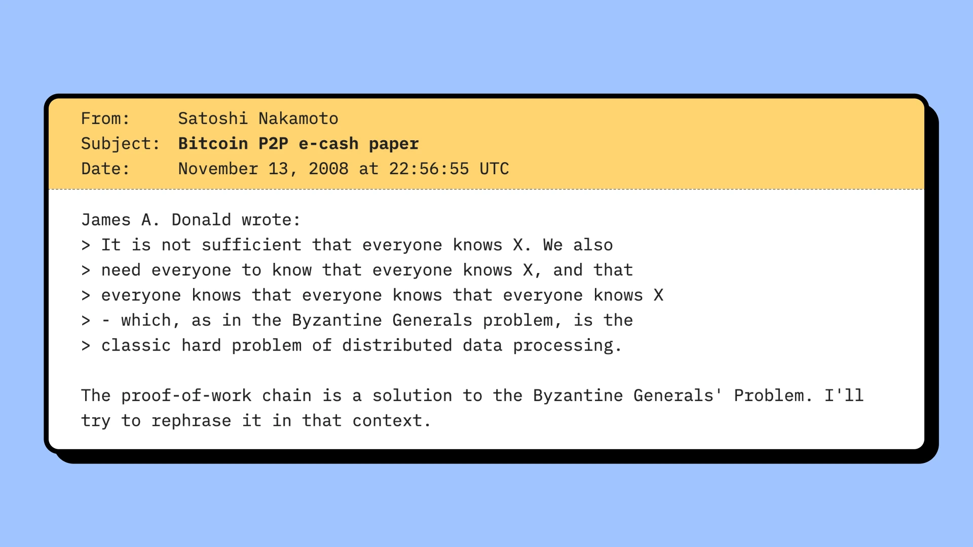 On November 13, 2008, Satoshi Nakamoto explained the biggest scientific breakthrough — the solution to the Byzantine Generals Problem — in personal correspondence with James A. Donald.