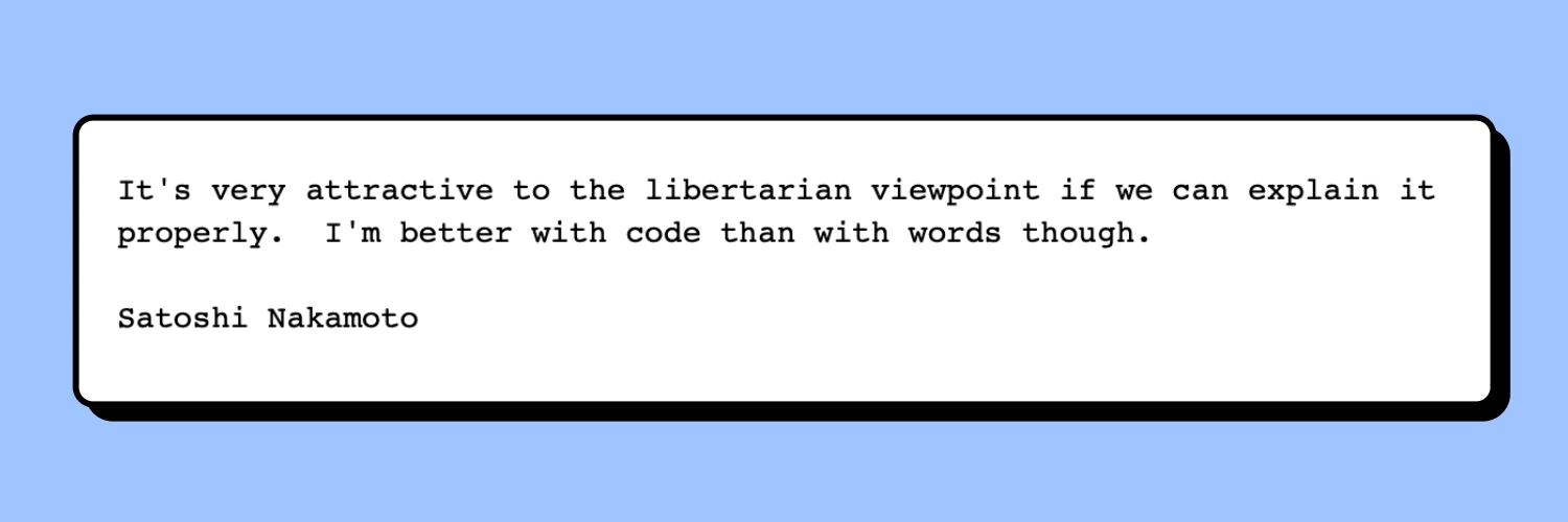 On November 14, 2008, Satoshi is thinking of ways to widen Bitcoin's reach: "It's very attractive to the libertarian viewpoint if we can explain it properly. I'm better with code than with words though."