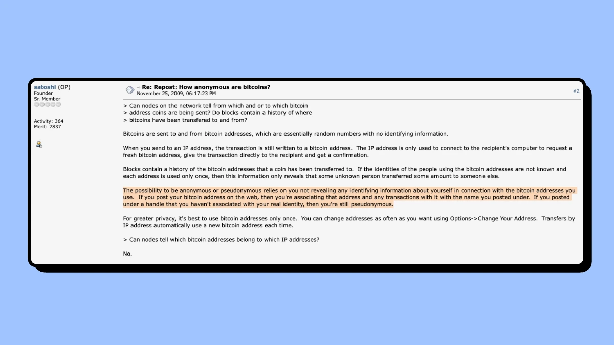 On November 25, 2009, Satoshi answers the question on Bitcoin anonymity.