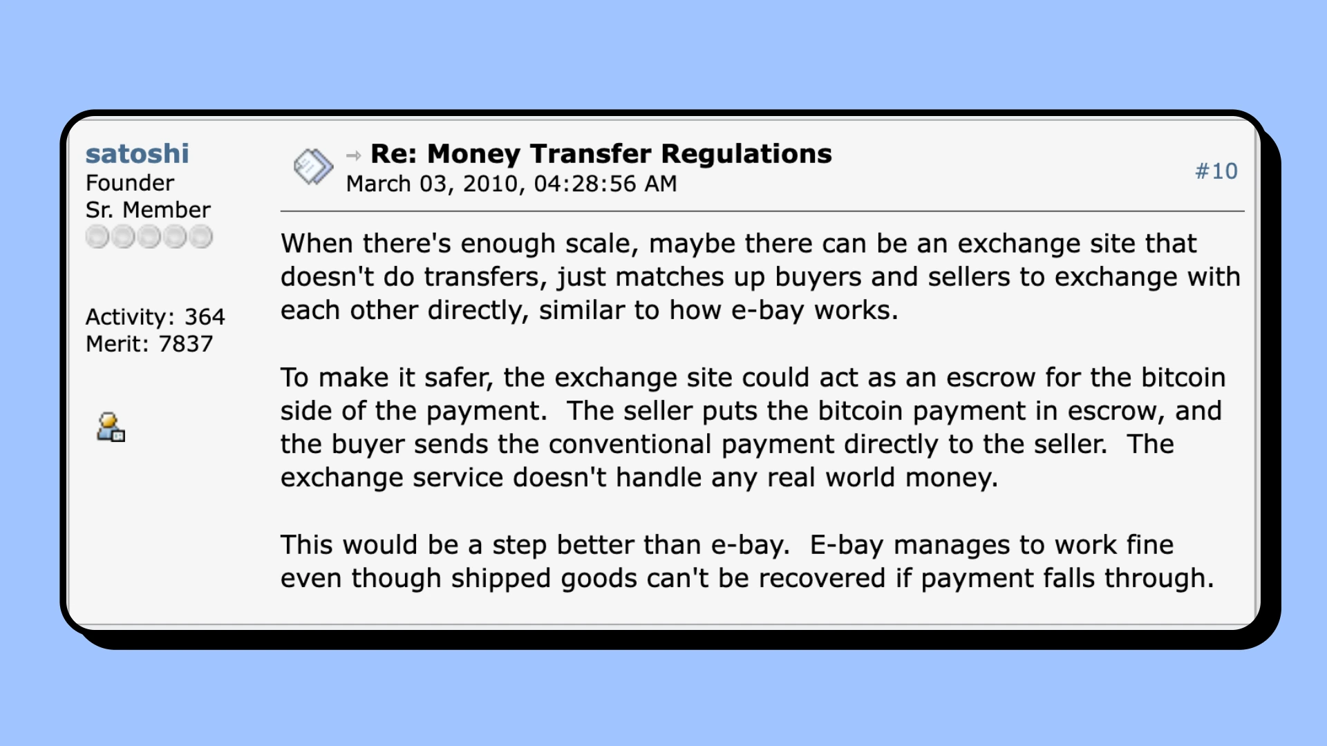 On March 3, 2010, Satoshi explains how p2p platforms coordinating bitcoin trading can work.