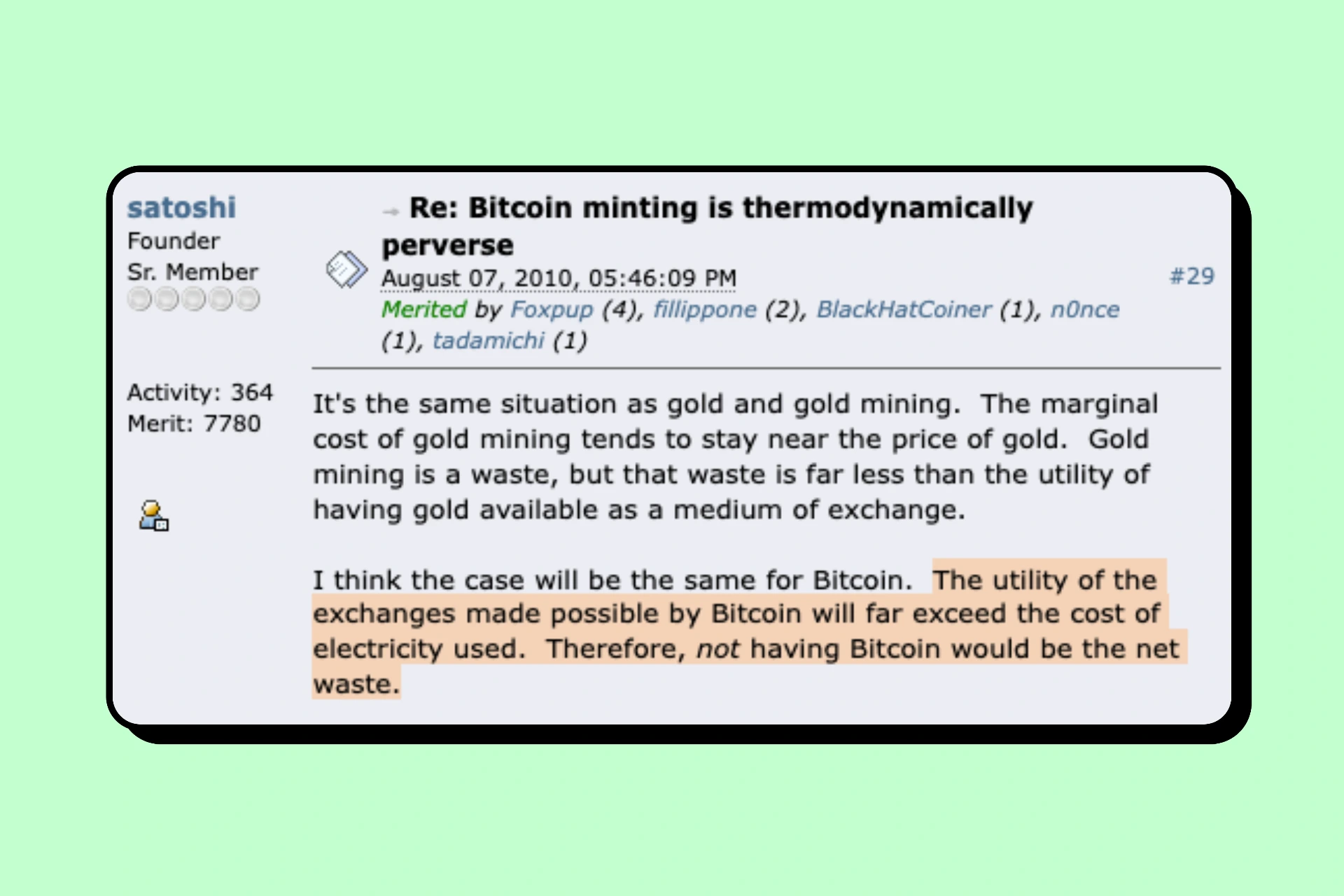 On August 7, 2010, Satoshi challenged the assertion that Bitcoin's use of PoW was a waste. 1 BTC = $0.06