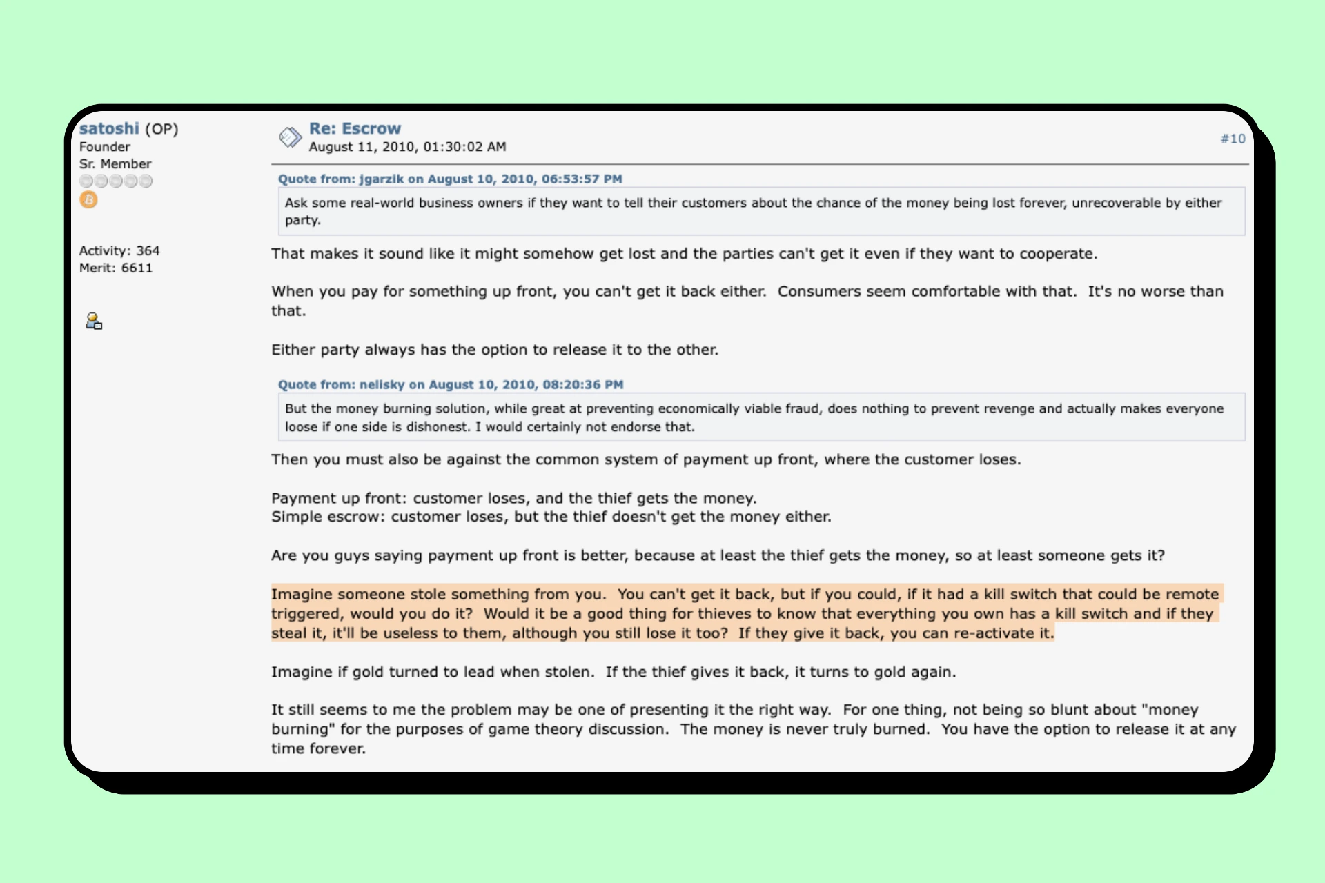 💡 Satoshi Proposes Automated Bitcoin Escrows