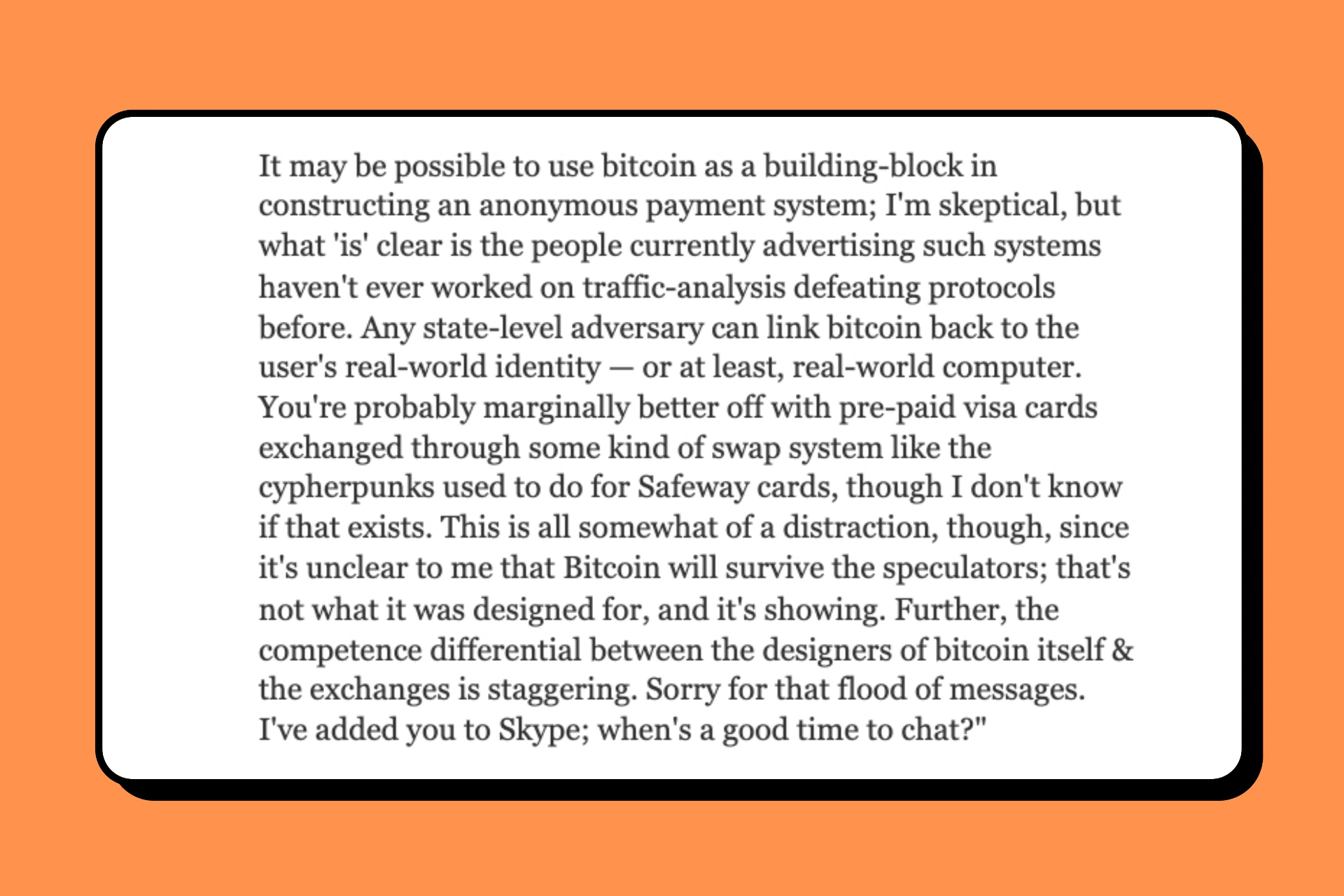 On June 25, 2011, in private correspondence with Jon Matonis, Len Sassaman expressed his concerns about privacy (or rather, lack of privacy) in Bitcoin: "Any state-level adversary can link bitcoin back to the user's real-world identity — or at least, real-world computer."