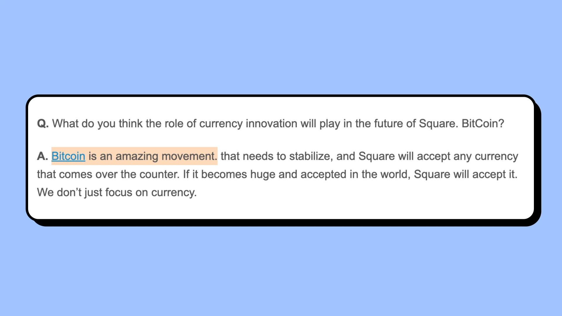 On September 13, 2012, Jack Dorsey publicly mentioned Bitcoin for the first time. 1 BTC = $11