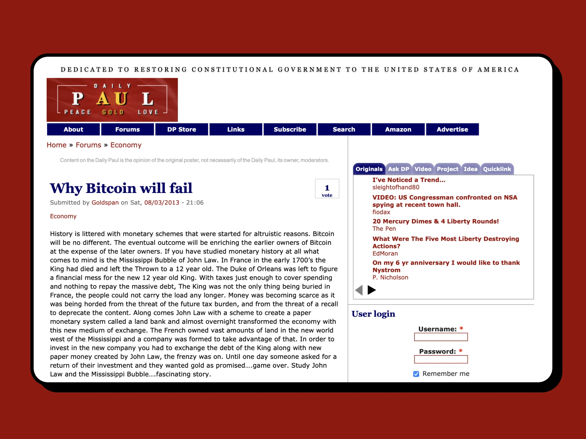 On August 3, 2013, the gold bug website Daily Paul published an article "Why Bitcoin Will Fail," where the author, among other now clichéd criticisms of Bitcoin, lamented its lack of "intrinsic value" and compared it to the "Mississippi Bubble." 1 BTC = $97.24