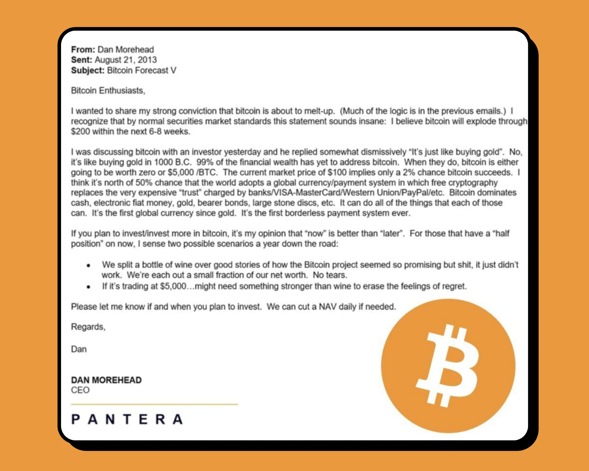 On August 21, 2013, investor Dan Morehead explained to his partners why investing in Bitcoin was a good idea. "It's like buying gold in 1000 B.C." 1 BTC = $100