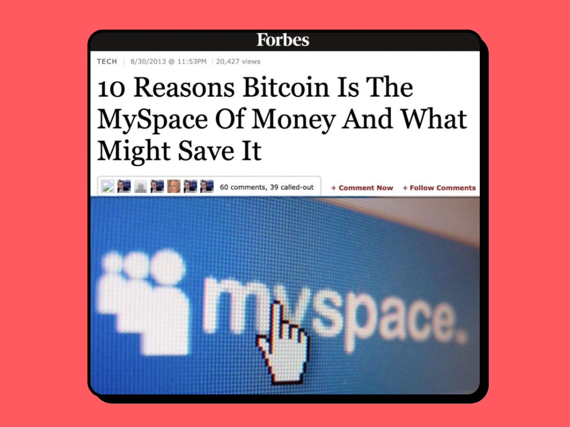 On August 30, 2013, Forbes published an article "10 Reasons Bitcoin Is The MySpace Of Money And What Might Save It".