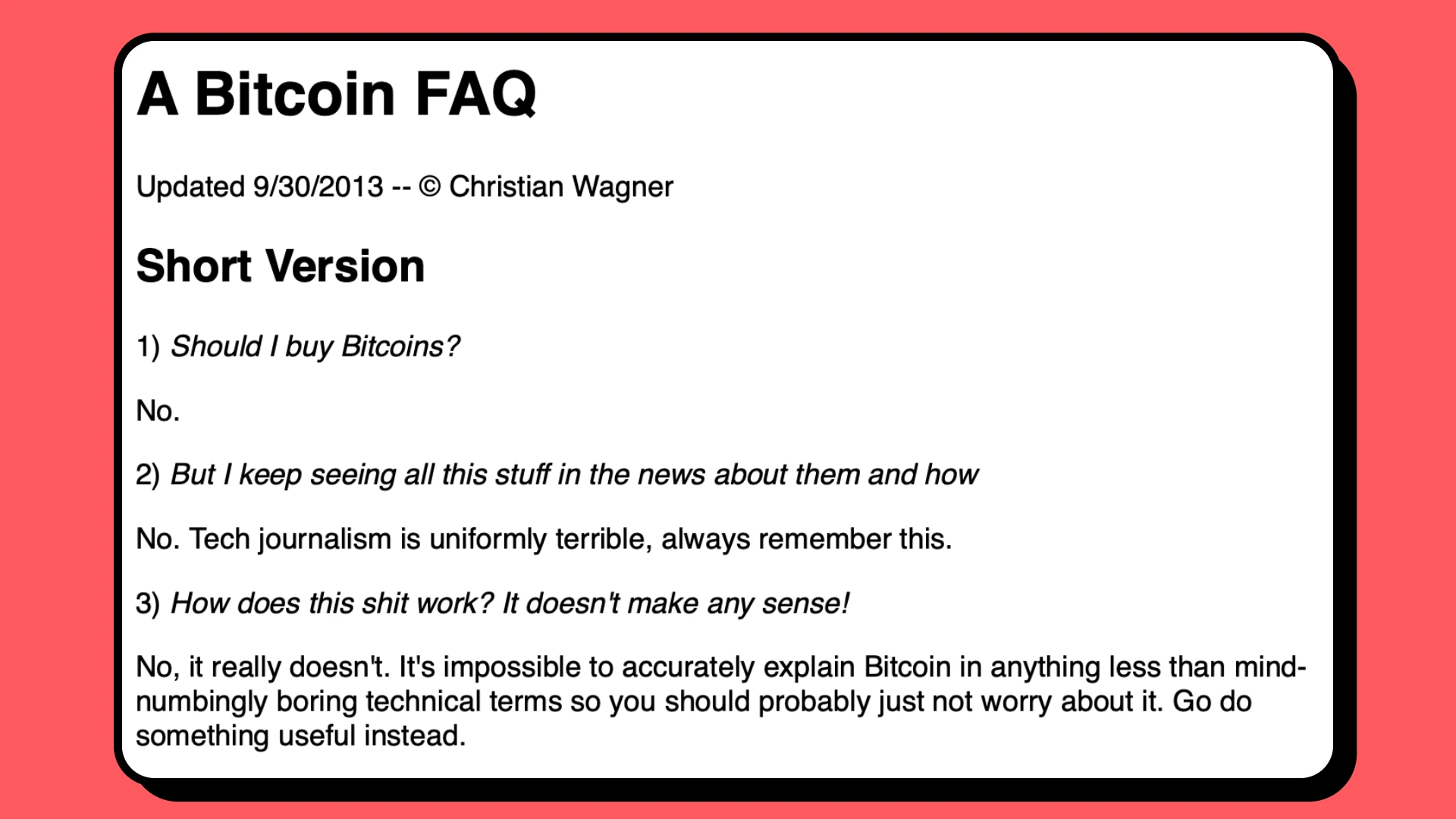 On September 30, 2013, Christian Wagner publishes a FAQ page dedicated to why you shouldn't buy Bitcoin.