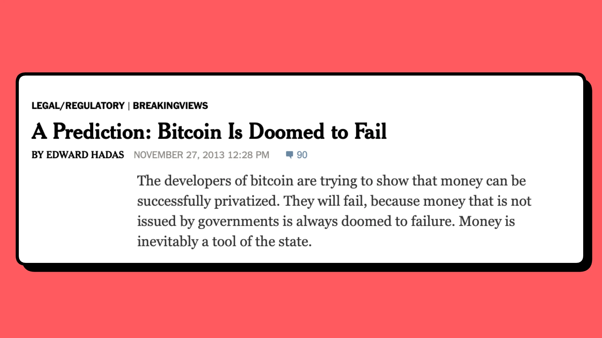 On November 27, 2013, an article titled "Bitcoin is Doomed" was published in the New York Times: "Money that is not issued by governments is doomed to fail. Money is inevitably a tool of the state." 1 BTC = $899.20