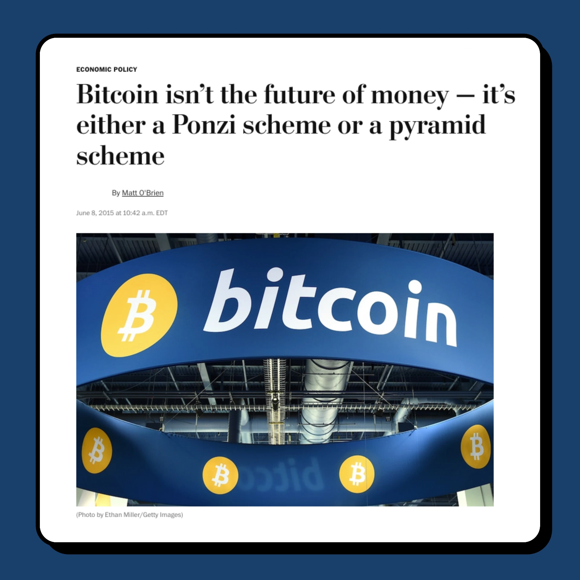 On June 8, 2015, The Washington Post published an article titled "Bitcoin isn’t the future of money — it’s either a Ponzi scheme or a pyramid scheme". Parker Lewis's article explains why Bitcoin is neither.