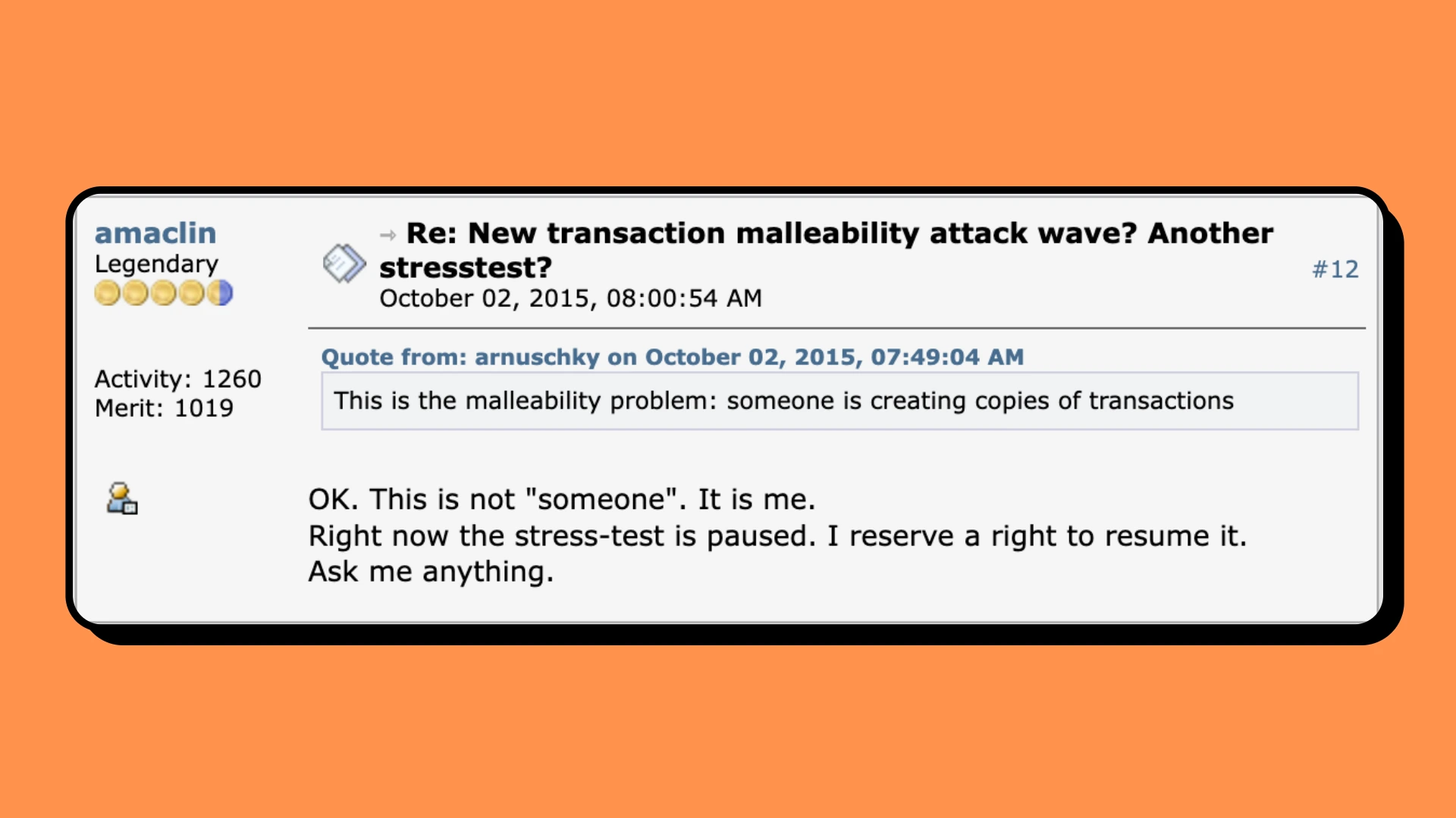 On October 3-4, 2015, Alistair MacLean attacked the Bitcoin network by substituting the S value in ECDSA signatures of user transactions.