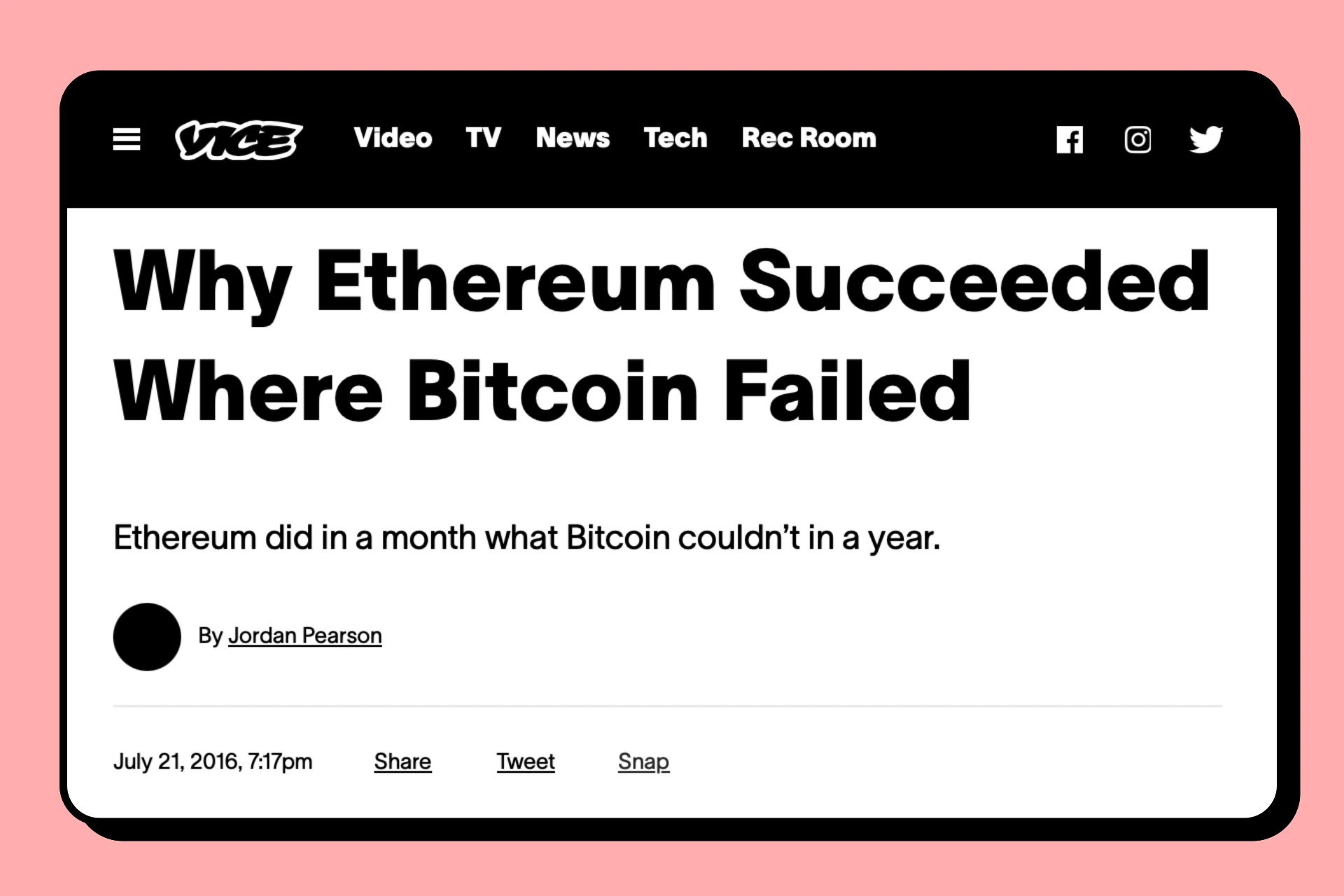 On July 21, 2016, in light of the completed Ethereum hard fork, Vice published an article "Why Ethereum Succeeded Where Bitcoin Failed".