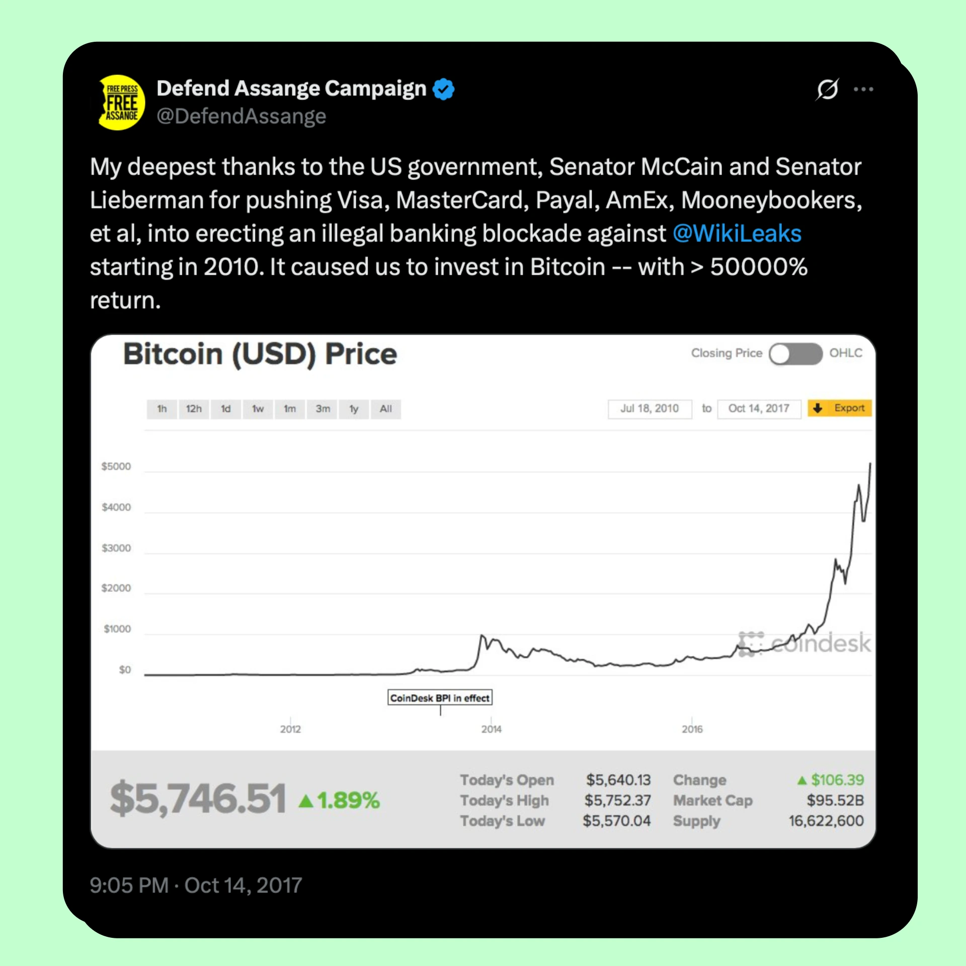 "I want to express my deepest gratitude to the US government, Senator McCain, and Senator Lieberman for pushing Visa, MasterCard, PayPal, AmEx, Moneybookers, etc., to impose an unlawful banking blockade against WikiLeaks, which began in 2010. This forced us to invest in Bitcoin and gain a profit of over 50,000%."