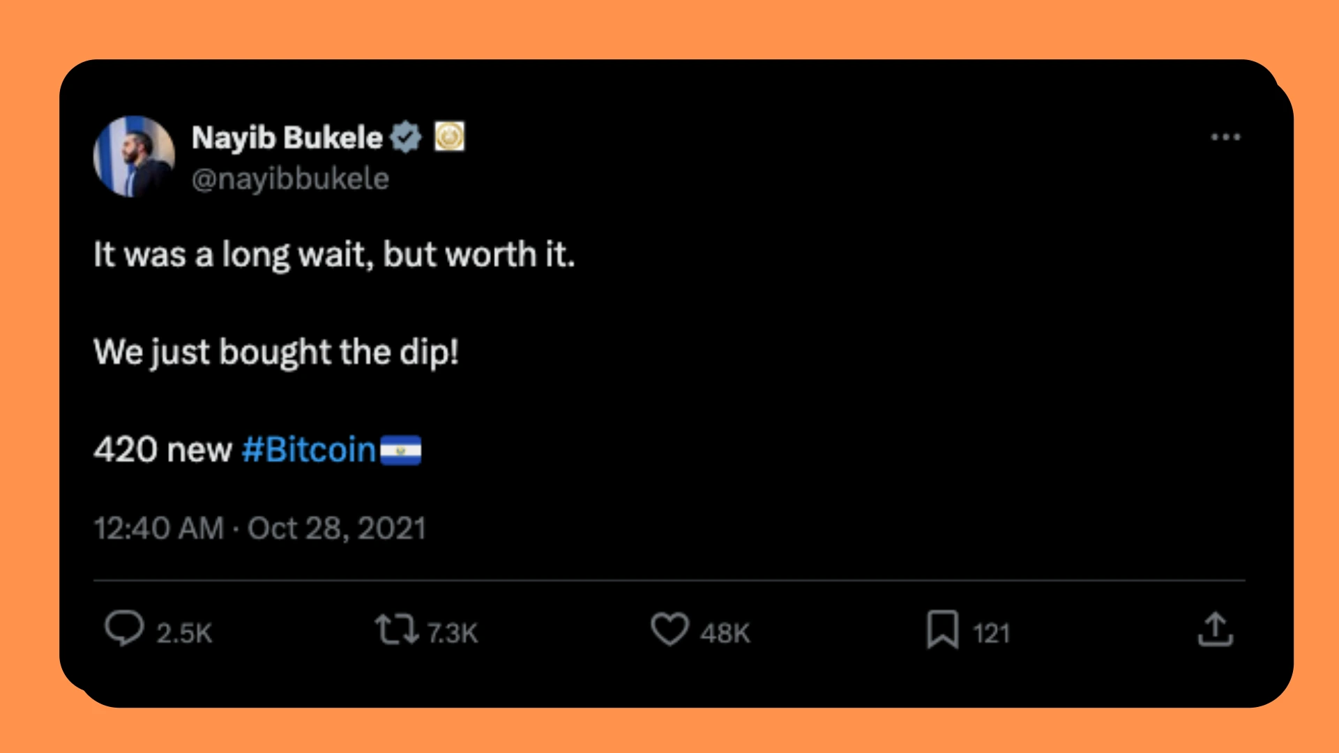On October 27, 2021, El Salvador acquires 420 bitcoins. 1 BTC = $60,500