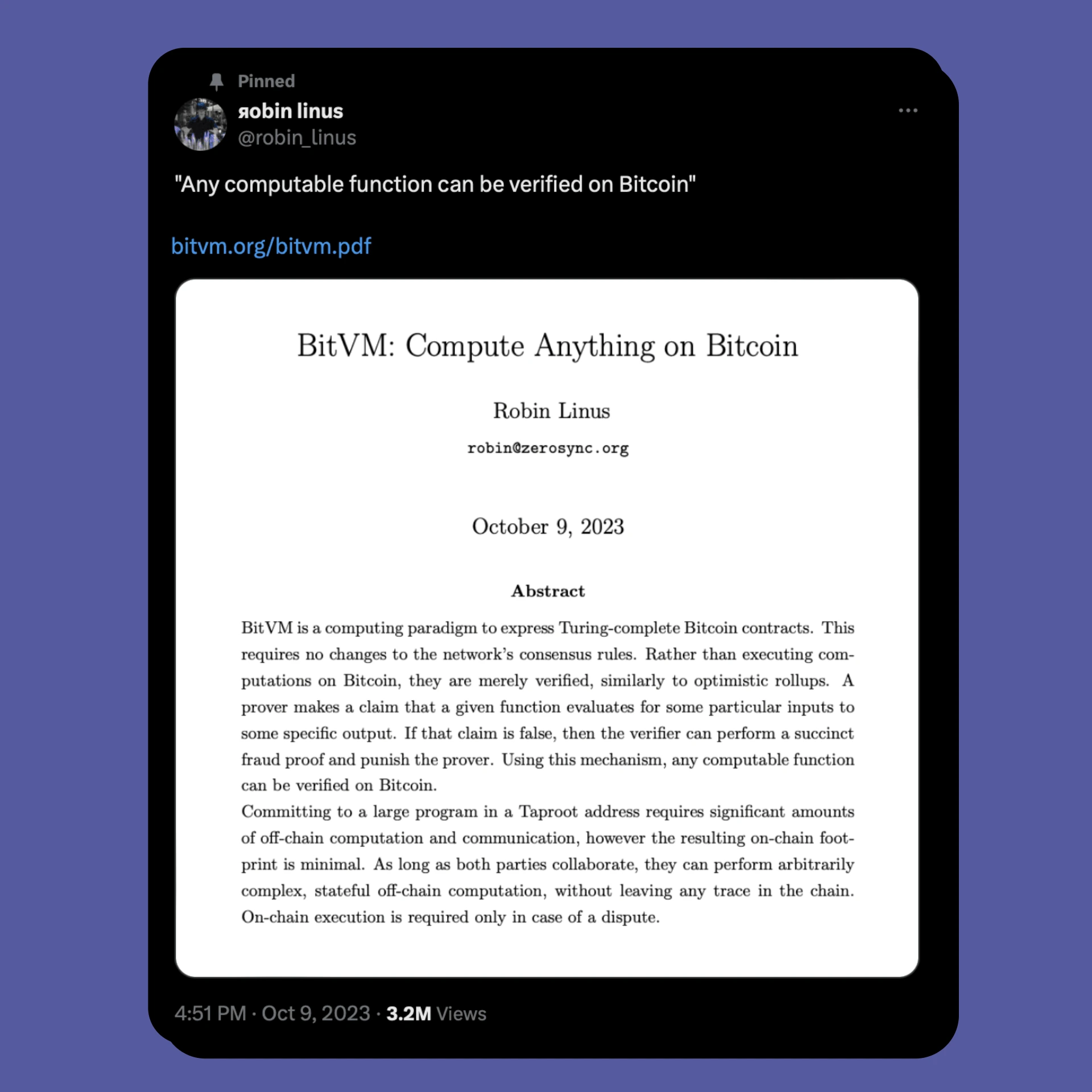 On October 9, 2023, Robin Linus announced the launch of the BitVM project – a virtual machine aimed at expanding the functionality of the Bitcoin network.